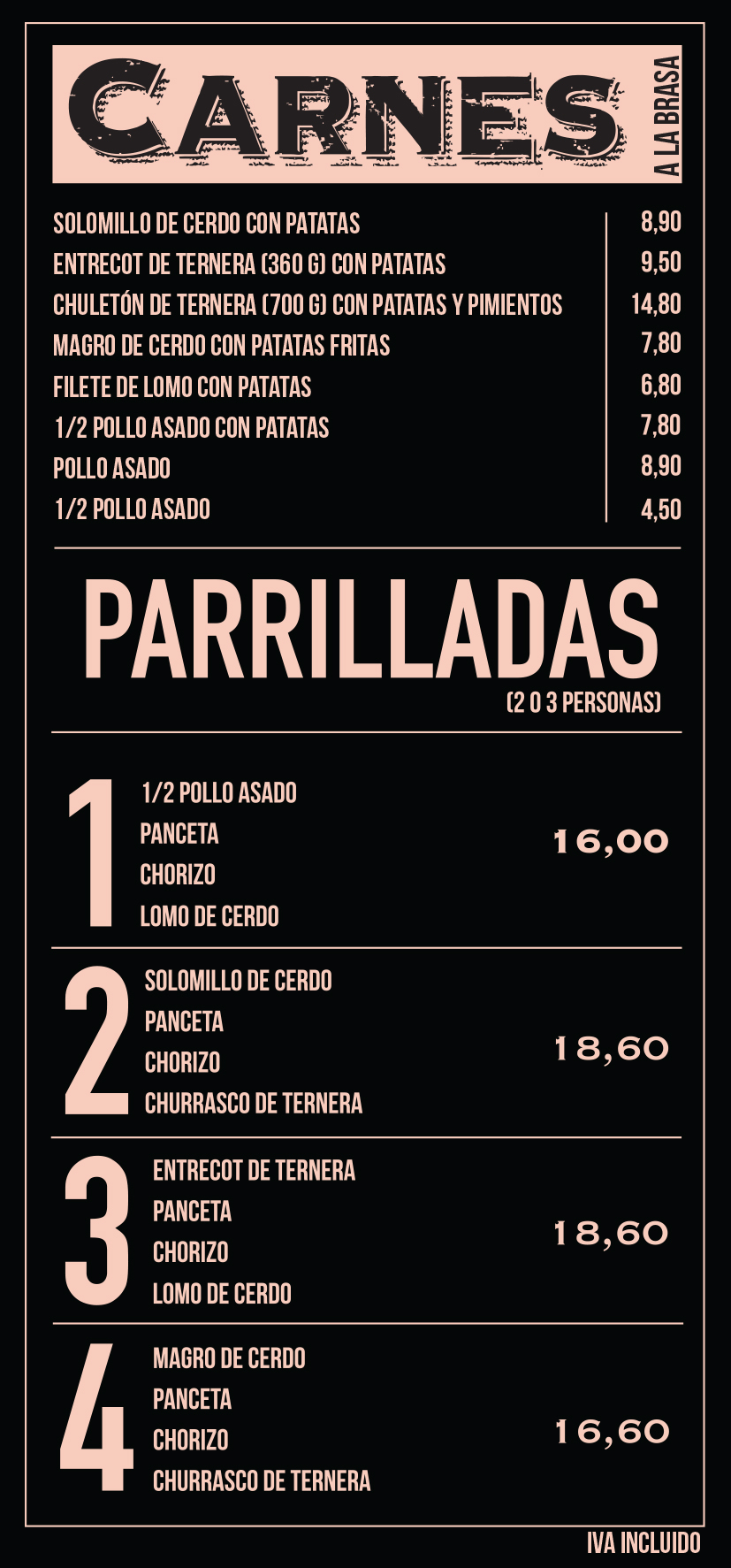 Comenzar Tabla de Ibericos, entremeses calientes o cualquiera de nuestros entrantes. Continuar con nuestro Pollo Asado, Carnes a la Brasa o compartir una de nuestras Parrilladas de carne...